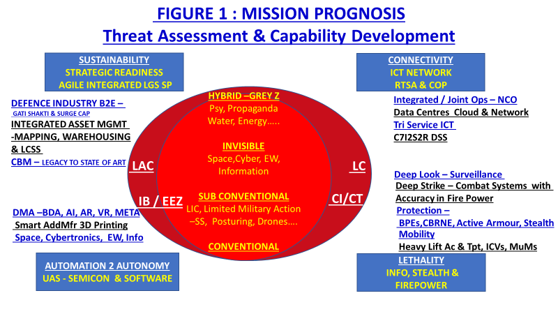 Threat Scenario Building. Armed Forces have to operate, and therefore, be prepared for the complete continuum of conflict spectrum from sub conventional to conventional including CBRN, grey zone and hybrid warfare. These threat scenarios are further accentuated by cyber, electronics warfare, psychological (Informational / dis-informational) and unmanned autonomous system threats which have generated a technology and counter technology capability development race in the contact kinetic and non contact non kinetic domains. There is a dire need to be prepared for a multi domain, multi dimensional threat and create hardened structures for defensive deployments, warehouses and futuristic weapon platforms. Further, there is a need to prepare secure net centric digital military infrastructure comprising data centres, cloud, networking sensors, application software. Figure 1 below brings out the mission prognosis of threat assessment and pillars of capability development.