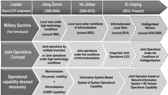 PLA aims to complete force modernisation by 2035 and to be a world-class military by 2047 (Burke 2020, 01).16 This entails them to evolve the ‘Intelligentized Warfighting’ capability over varying timeframes as given below: –