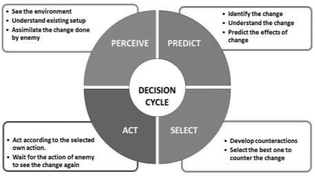 - Battle Decision-Making Setup. The intimate interlacing of precision at tactical operations and innovation at operational planes will mutate the Observe-OrientDecide-Act (OODA) loop into the Perceive-Predict-Select-Act (PPSA) Decision Cycle which would be a predictive model based on data. Under this model, the intelligent machine supported by AI will recognise the battlefield changes to predict the various courses of action that can be envisaged from an enemy based on their capability, terrain, capability of their forces, etc. The multiple courses of action of the enemy will be analysed by algorithms to suggest suitable counteracts that PLA must take. The human interface in this MUMT will analyse both enemy and PLA actions suggested by the intelligent system to produce the most suitable one for PLA forces.