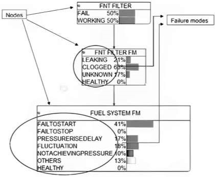 - Fuel System. The complete fuel system was divided into its individual components and these components were displayed as nodes in the network and failure modes of these components were displayed as the states of a particular node. These failure modes of the components were taken from FMD 91 and OREDA. The same procedure was followed for all the systems.