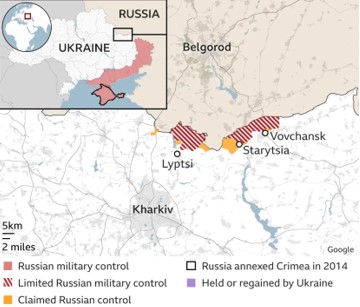 Continuing on the spree of inching forward to capture more and more of the Ukrainian territory (albeit at cost of heavy casualties) the Russian forces, in early May 2024 started to advance towards the North and NE side of Kharkiv the second biggest city of Ukraine. A three pronged drive headed towards the town centre, fighting a bloody battle as Ukrainians fought bravely village-to-village. (see map).