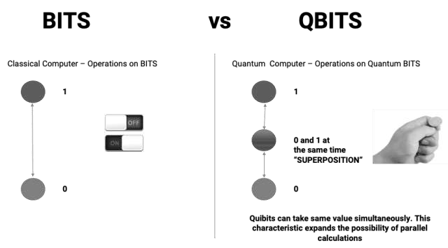 A qubit uses the quantum property of superposition to be simultaneously in two states. A qubit can signify ‘0’ and ‘1’ at the same time and a system having two qubits can represent four states at the same time (00, 01, 10, 11). Consequently, quantum computing of a two qubit system will be four times faster than a two bit classical computing. Accordingly, In case of ‘n’ bits, the speed will increase to 2^n times. If n =56, then 2^56 is of the order of ‘Trillions’. It is expected that quantum computers, in future, may be million times faster than a super computer.