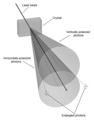 This spontaneous parametric down-conversion diagram illustrates a Laser beam passing through a crystal’s optical axis which leads to photons’ diffractions and polarizations leading to quantum entanglement. Measurements carried out on entangled photons proved beyond doubt that the properties were perfectly interrelated.
