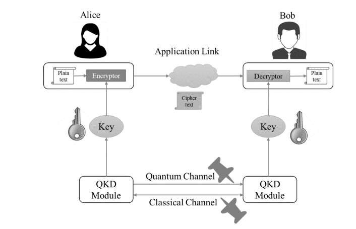 There are many protocols which have been developed for QKD. BB84 is one such QKD which is already in use. Understanding its working will clear the concept of QKD. Suppose, there are two persons Alice and Bob. Alice wants to transmit information securely to Bob. For this, she generates an encryption key as sequence of qubits which are sent to Bob through a quantum channel and measurement data through classical channel. With this information, he is able to decode the key. In case there is any attempt to intercept the signal, some of the qubits collapse and the receiver gets alerted. In that case they reject the key and generate a new key and accept only when there is no indication of attempt to intercept. Alice can now encrypt the data with her keys and send it in classical bits to Bob, who, in turn decodes the data with his keys.12