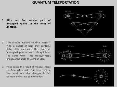 Quantum teleportation is a very innovative technology for transmitting data in pure quantum form. This technology is based on the principle of quantum entanglement. Here, entangled photons pairs are created. One photon of this pair is transmitted to Alice who is sender of data and the second photon is transmitted to Bob, the receiver. Alice, on receiving her entangled photon, allows it to interact with a “memory qubit” that houses the data to be transmitted to Bob. This exchange alters the state of her photon, and since Bob has the entangled photon, its state also changes simultaneously. Thus, the data in Alice’s memory qubit from her photon is “teleported” to Bob’s photon from where it is extracted. The graphic below lays out the process:14