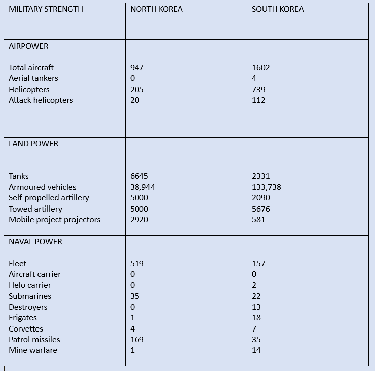 North Korea has strong allies like Russia, Iran, Pakistan, China. The most important rival for North Korea is the US. Besides, there are significant differences between South and North Korea in terms of geography and demography. Landmass approach should be synthesized with maritime approach as South Korea already has an upper hand with its blue water navy when compared with North Korea’s brown water navy. South Korea is more densely populated, while the north-western area of North Korea is sparsely populated, which can make that region an important site for arms deployment. Seoul’s proximity to the DMZ makes it an easy target for an attack. South Koreas’s nominal GDP is 57 times greater than North Korea’s in 2021. 2021 data reveals that the infant mortality rate in North Korea is higher, population growth rate is around 2 times higher in North Korea, and life expectancy is higher in South Korea. Both have conscription for army recruitment. From age 18, citizens can enrol themselves in army in Seoul , for North it is 17 years, while conditions are harsher and strict in DPRK. The military capabilities of both Korea’s are compared below.