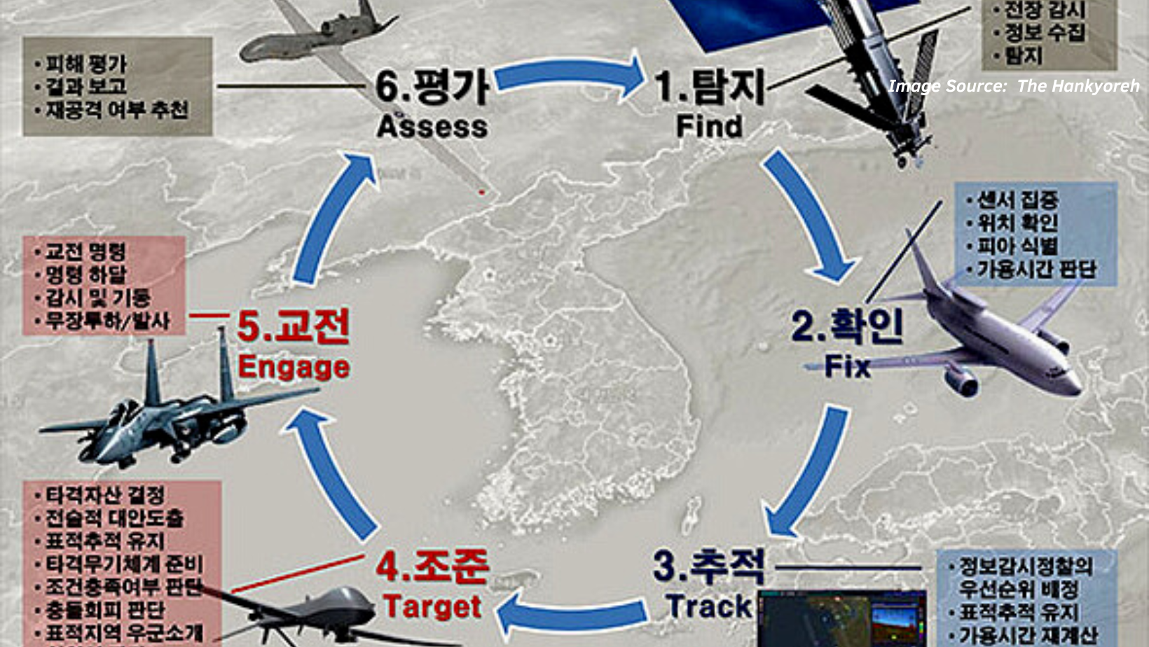 The Kill chain is a South Korean military strategy devised to launch a preemptive strike on North Korean military assets to eliminate the possibility of launching a counter strike by Pyongyang. It is based on eliminating the perceived threat, before it gets real. South Korea possesses ballistic and cruise missiles, both submarine and surface-based. Hyunmoo 1, and Hyunmoo 2A both are operational short range ballistic missiles (SRBM). Hyunmoo 3 is a land attack cruise missile (LACM), other missiles like Haesong I, an anti-ship cruise missile (ASM) are vital for the kill chain. Haeseeong II, a supersonic missile has two variants, SL (Slant launch) and VL (vertical launch) is a significant component of Kill Chain. Haesong III is a submarine-launch missile with a range of 1500 km. Most of the missiles have a good circular error probability (CEP) . Surveillance assets are a critical component for maintaining security. Currently, South Korea relies on the US for military technology, though they are a major weapon exporter country, their air defense system and surveillance assets are of US origin. The Yoon administration has been making greater efforts to indigenise its weapons