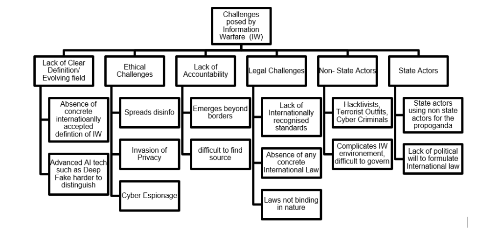 The international legal framework is currently under-equipped to address information warfare effectively, with key issues related to defining the boundaries of cyber warfare, enforcement of regulations, and establishing accountability. Non-state actors’ involvement further complicates the scenario as they often operate outside the traditional legal framework. India, specifically, faces challenges such as a lack of comprehensive cybersecurity legislation, gaps in data protection laws, the need for increased cyber literacy, the necessity for capacity building in resources and capabilities, and room for improved cooperation with tech companies. Simultaneously, efforts should be made to foster international cooperation to develop universal norms and guidelines for cybersecurity and information warfare. This includes contributing to the development of definitions for acts of cyber warfare, establishing accountability norms, and enforcement mechanisms.