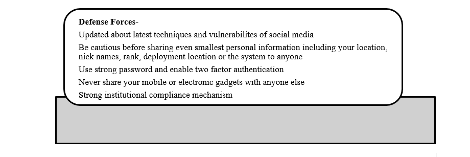 The very characteristics that make social media a powerful tool – its global reach, open access, and rapid information sharing – can also be its biggest downfall. When personnel from Indian armed forces and other government staff who deal with critical information related to the nation’s internal and external security, nuclear power, space research, defense R&D, and other key infrastructures, use these platforms, it can open up severe security risks. This could jeopardize not only them but also their friends and families. Personal details, geo- tagging their locations including inside the government facilities or those of family members, shared on these platforms can be easily exploited by harmful entities. This information can serve as a valuable trove of intelligence, potentially causing significant harm to the personnel and the nation’s security infrastructure. (Ryan et al. 2016) (PIB, 2019)