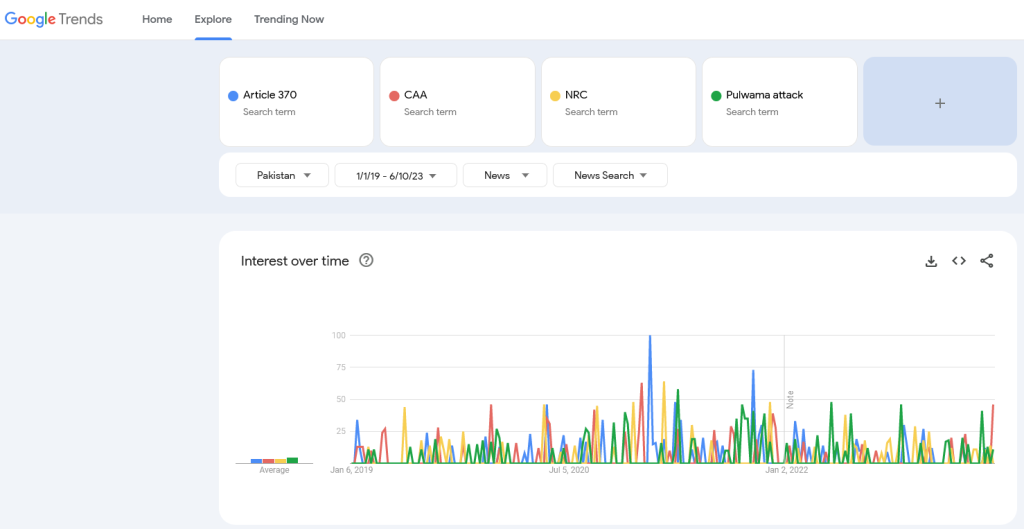 - Google Trends. 2023. “Google Trends Analysis.” Google Trends. https://trends.google.com/trends/explore?cat=16&date=2019-01-01%202023-06-10&geo=PK&gprop=news&q=Article%20370,CAA,NRC,Pulwama%20attack