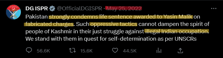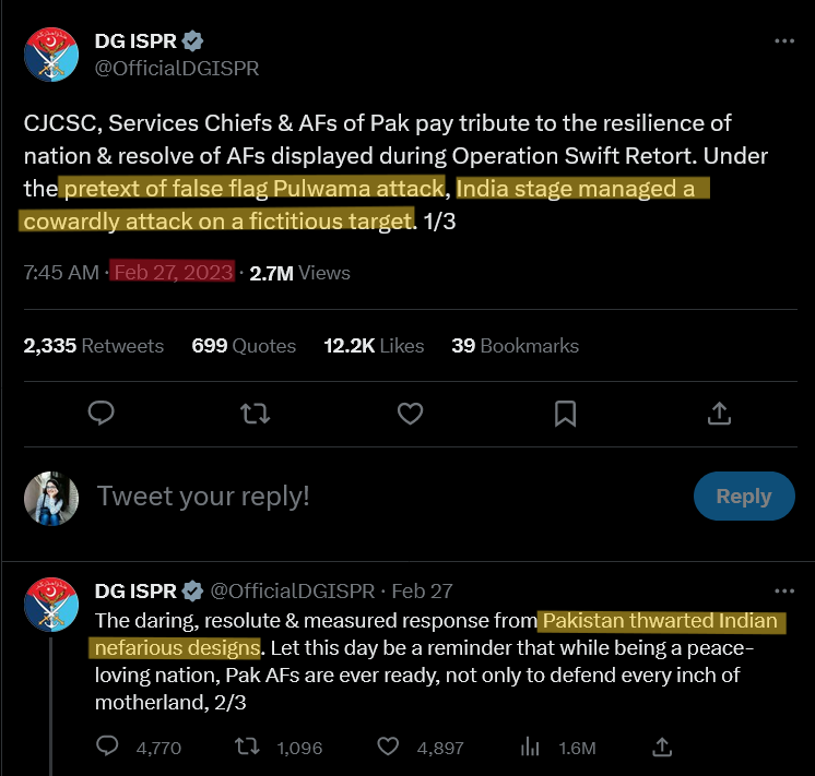 Along with social media, The Inter-Services Public Relations (ISPR) which serves as the media and public relations arm of the Pakistan Armed Forces, disseminates military news and information to the country’s civilian media and the general public. It serves as the primary voice for the Pakistani military, with the director-general representing the official voice of the armed forces. The ISPR’s involvement in entertainment could lead to narrative control, pushing a specific state-sponsored ideology and limiting viewpoint diversity, inhibiting critical thinking. This participation risks turning content into propaganda, skewing public opinion to favor state and military interests, potentially at the expense of balanced realism. The risk of censorship is increased, potentially suppressing critical content and limiting creative freedom. Additionally, there’s potential for bias in ISPR-backed productions, likely highlighting positive military aspects while downplaying negatives or controversies. (Subramanian 2021) ISPR has been actively engaged in commenting on various events occurring in or near Kashmir and expressing solidarity with the general public of Jammu and Kashmir. They have often voiced concerns about what they perceive as “atrocities” committed by the Indian government (Sethi 2020) Furthermore, ISPR has shown support for free speech and the rights of individuals living in Kashmir. Figure 6 displays a compilation of tweets from the official DG ISPR handle between 2022-2023 that has consistently criticized and undermined the Indian government.