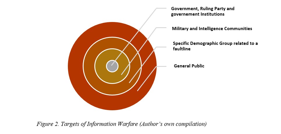 Information warfare is strategically targeted and meticulously designed to foment confusion and misunderstanding among people. This is achieved by presenting multiple, often conflicting, perspectives on the same event or fact, capitalizing on people’s religious, cultural, or societal divisions. It primarily targets four broad categories of audiences (Figure 2):