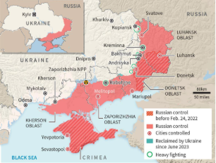 - After submerging most of Ukraine in cold and dark winter with many strikes on its energy grid 2023, Russian forces took up a multi-layered defensive line across the line Kupiansk, Kreminna, Bakhmut, Robotyne (see map below). The defences were so effective that these blunted and petered out the Ukrainian counteroffensive that aimed to do a blitzkrieg type of operation piercing through multiple axes and attempting to reach Sea of Azov and capture Mariupol.8